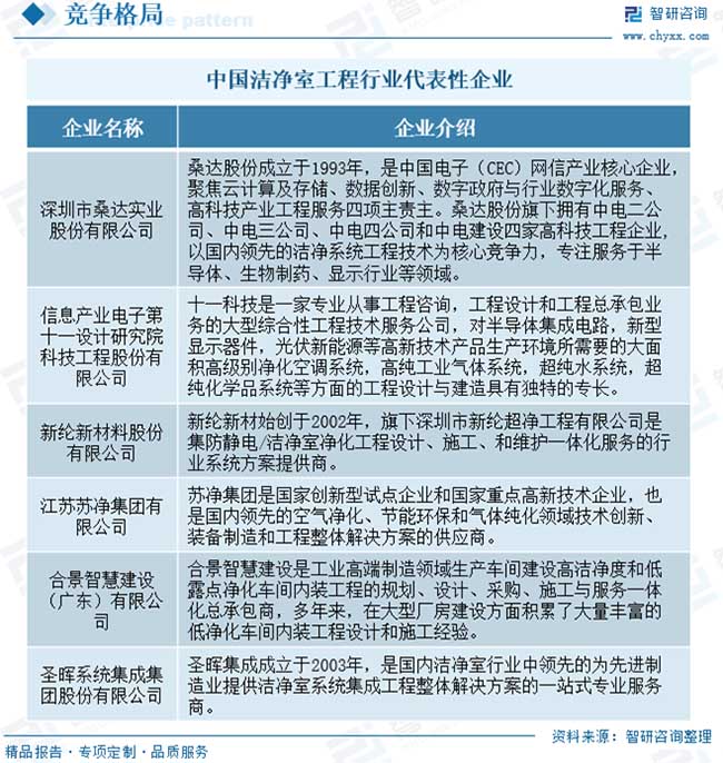 超潔凈環(huán)境控制又融合了風(fēng)險(xiǎn)評(píng)估、生產(chǎn)認(rèn)證的概念和程序,加之潔凈技術(shù)跨行業(yè)、跨專(zhuān)業(yè)、跨學(xué)科的特點(diǎn),使得潔凈室工程的難度和復(fù)雜性增加。因此對(duì)于潔凈室工程行業(yè)來(lái)說(shuō),優(yōu)化設(shè)計(jì)、現(xiàn)場(chǎng)施工環(huán)境的協(xié)調(diào)與管控、工程相關(guān)技術(shù)細(xì)節(jié)的經(jīng)驗(yàn)積累,對(duì)客戶(hù)需求的理解和實(shí)現(xiàn),以及對(duì)設(shè)計(jì)變更的準(zhǔn)備和響應(yīng)程度等都是衡量潔凈室工程企業(yè)競(jìng)爭(zhēng)能力的重要指標(biāo)。?目前,我國(guó)潔凈室工程行業(yè)競(jìng)爭(zhēng)較為激烈,企業(yè)數(shù)量較多。其中,桑達(dá)股份、十一科技、蘇凈集團(tuán)、新綸新材、柏誠(chéng)股份、亞翔集成等設(shè)計(jì)研究院或建設(shè)承包企業(yè)在降低建造成本、提高潔凈室的穩(wěn)定性等方面占據(jù)優(yōu)勢(shì),能提供高端潔凈室系統(tǒng)集成解決方案,位居行業(yè)領(lǐng)先地位。同時(shí),行業(yè)內(nèi)還存在大量規(guī)模較小、技術(shù)水平與綜合解決方案能力有限的潔凈室工程企業(yè),普遍集中在對(duì)潔凈等級(jí)要求不高的低端市場(chǎng)。